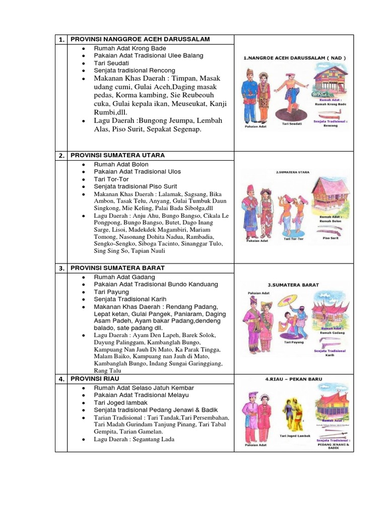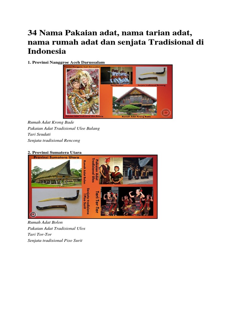 Rumah adat pakaian adat tarian adat dan senjata tradisional 34 provinsi