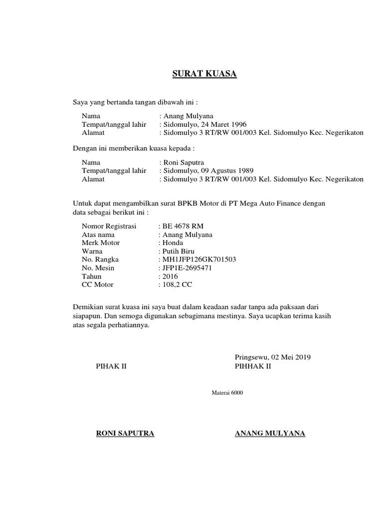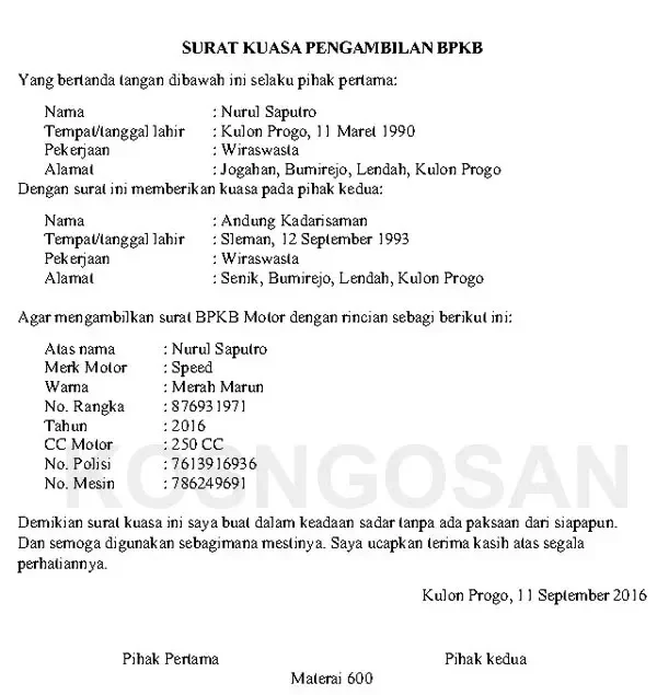 Contoh Surat Kuasa Pengambilan BPKB Motor. Saya yang bertanda tangan di bawah ini: Nama : Diaz Musthafa Tempat, Tanggal Lahir : Semarang, 9 April 1991 Jenis Kelamin : Laki-Laki Pekerjaan : Karyawan Nomor NIK : 317xxxxxxxxxxxxx Alamat : Jln. Kalibiru Barat No.11 Rt 06/001, Cilincing, Jakarta.