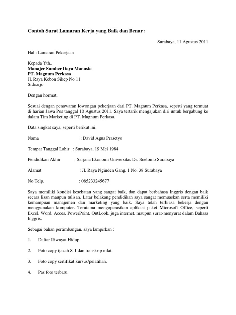 Contoh Surat Lamaran Kerja – Bekerja merupakan sebuah hal yang sangat mendasar untuk setiap orang. Sebab pasti, sebagai seorang manusia, kita sangat membutuhkan mata pencaharian untuk bertahan hidup. Meskipun pada hakikatnya hanya sebagai jalan rezeki dari Tuhan. Bilamana kita tidak mempunyai mata pencaharian / pekerjaan sama sekali untuk menghidupi diri, maka kemungkinan besar kita bisa ... Contoh Lengkap Surat Lamaran Kerja Yang Baik Dan Benar. Berikut ini merupakan contoh lengkap jika kamu menyatukan antara kalimat pembuka yang baik dengan seluruh isi dari surat lamaran kerja jika dikirimkan melalui email. Contoh ini bisa diterapkan untuk melamar kerja di berbagai bidang dan posisi yang ingin kamu lamar :