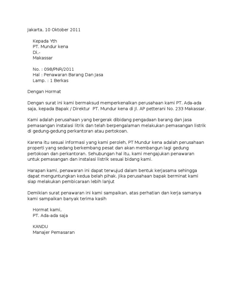 Contoh surat penawaran barang. Contoh Surat Pengajuan – Dalam dunia kerja, surat pengajuan terbilang sangat sering dipergunakan. Pengajuan atau permohonan bisa dibuat oleh bawahan kepada pimpinan, ataupun antar instansi dan kantor. Dalam hal ini, ketika anda menginginkan sesuatu hal, namun tidak bisa memutuskannya sendiri dan harus meminta persetujuan dari pihak lain. Contoh Surat Pernyataaan Tanggung Jawab Mutlak (SPTJM) biasanya dibuat untuk dilampirkan ke dalam sebuah proposal bantuan keuangan. Surat Tanggung Jawab Mutlak ini, ditandatangani oleh kepala dinas, kepala sekolah atau kepala desa. Contoh Surat Penawaran Produk . Penggunaan berbagai jenis surat niaga memang sudah dilakukan sejak dulu, salah satunya untuk menawarkan produk.Jika anda bingung cara menulis surat penawaran produk, maka tentu ada banyak contoh surat penawaran yang menjadi bahan referensi untuk anda.. Terlebih untuk anda yang masih sekolah dan kuliah, mungkin saja mendapatkan tugas untuk menulis surat penawaran ... Contoh Surat Permohonan Izin Keluar / Masuk Barang adalah sebuah surat yang digunakan sebagai administrasi dan bukti untuk mengontrol arus keluar masuk barang.