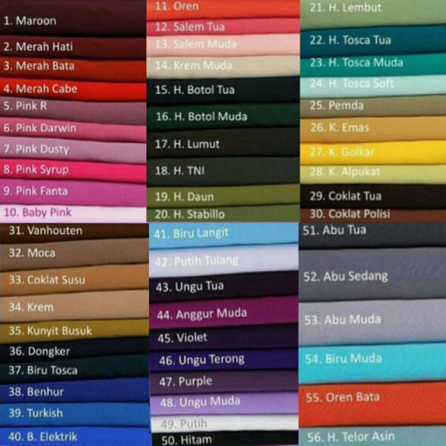 Warna jilbab yang lembut. Search the world's information, including webpages, images, videos and more. Google has many special features to help you find exactly what you're looking for. Kain jenis ini juga mempunyai daya serap keringat yang baik, tidak bikin gerah, dan tersedia dalam berbagai pilihan warna. Tetapi, kain ini umumnya kurang tahan lama, cenderung mudah melar, dan kualitasnya di bawah kain jenis fleece. Pada bagian dalam, kain ini juga mempunyai tekstur yang sangat lembut dan halus seperti selimut. Jawaban Ica Ica – Game ica ica adalah Permainan Chatbot Tebak Kata atau Software chatting di aplikasi Line, Ica-ica merupakan chatbot buatan anak bangsa yang sudah memenangkan boot awards 2018 di jepang. DAFTAR KUNCI JAWABAN BOT ICA ICA FAMILY 100 LINE Aduh Aku Digigit…. Jawaban : Nyamuk, Anjing, Ular, Tikus, Pacarku Apa Saja Kelemahan Polisi […] 2. Gunakan warna-warna yang mempunyai arti tertentu secara psikologis. Misalnya warna merah yang identik dengan toko makanan. Coba amati toko franchise “Mc Donald”, “KFC”, “RFC”, “Geprek Bensu” nama merek, kemasan snack maupun makanannya didominasi dengan warna merah. 3. Gunakan logo yang sederhana dan tidak rumit untuk online ...